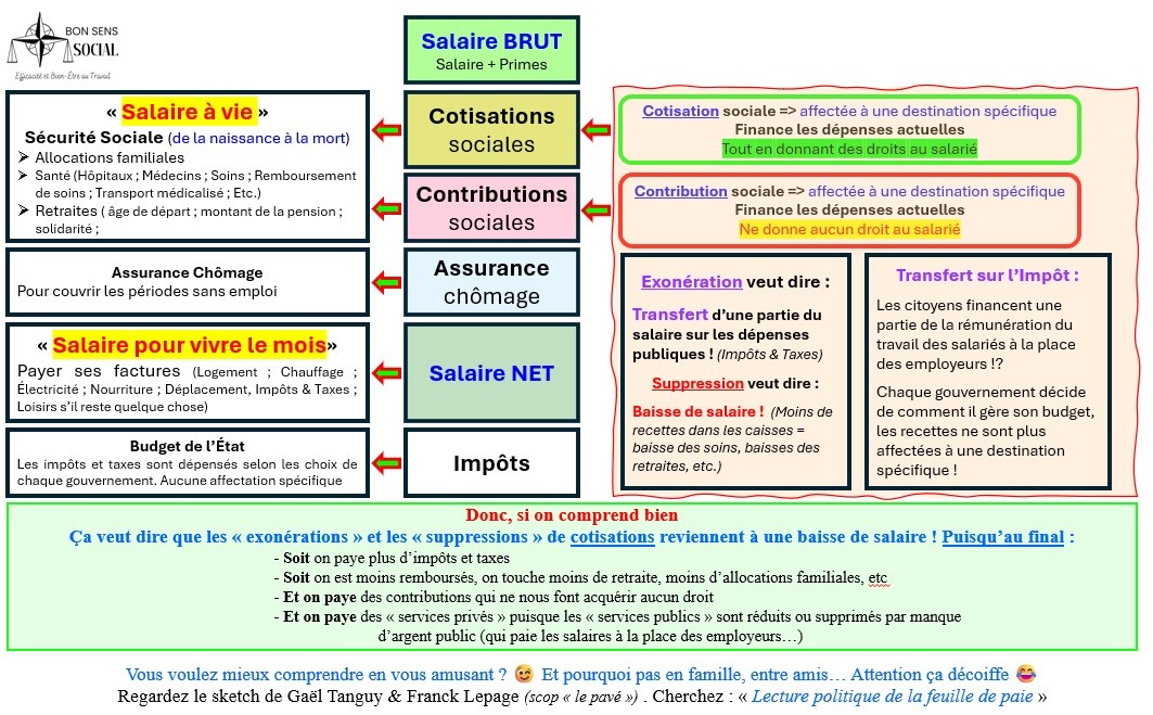 - Les « charges patronales » n’en sont pas 👉 Ce sont des cotisations qui financent « votre protection maladie », « votre retraite », et « la famille » (Elles font partie du salaire pour la vie)